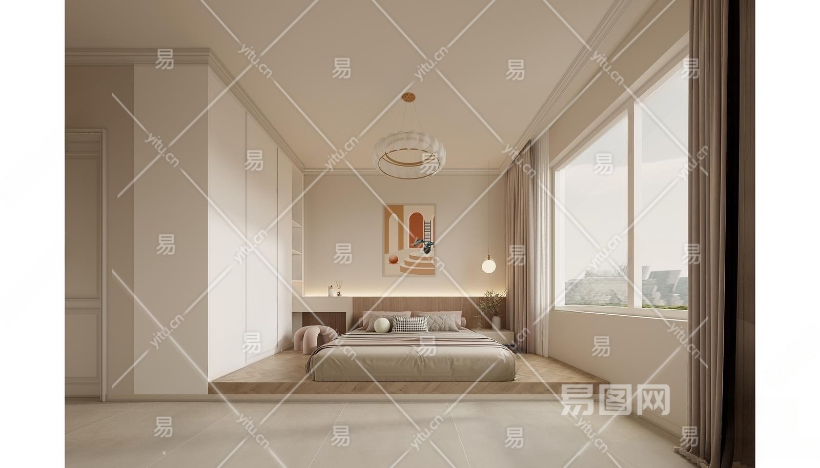 现代奶油风卧室3D模型下载