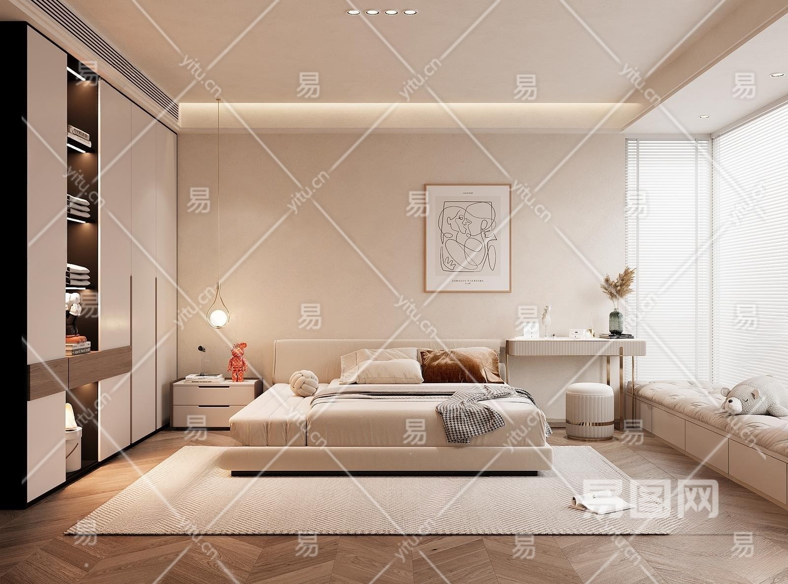 现代奶油风卧室3D模型下载