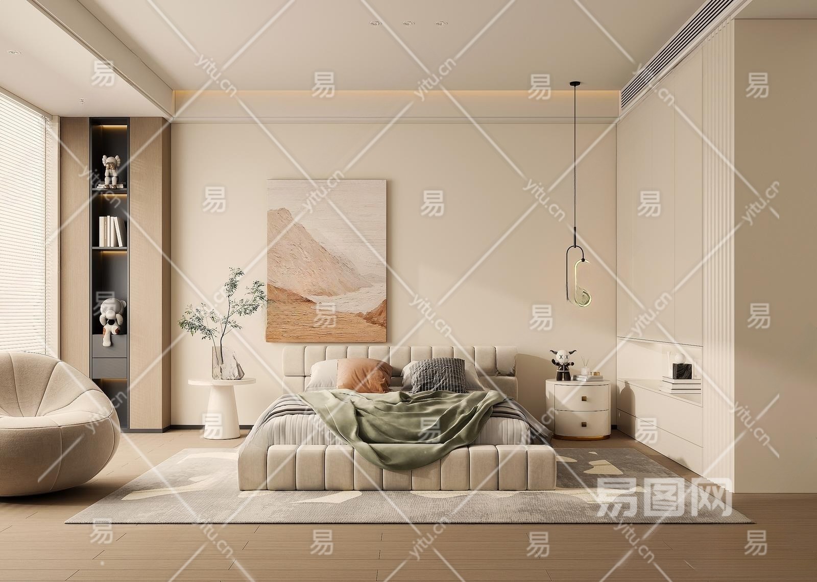 现代奶油风卧室3D模型下载