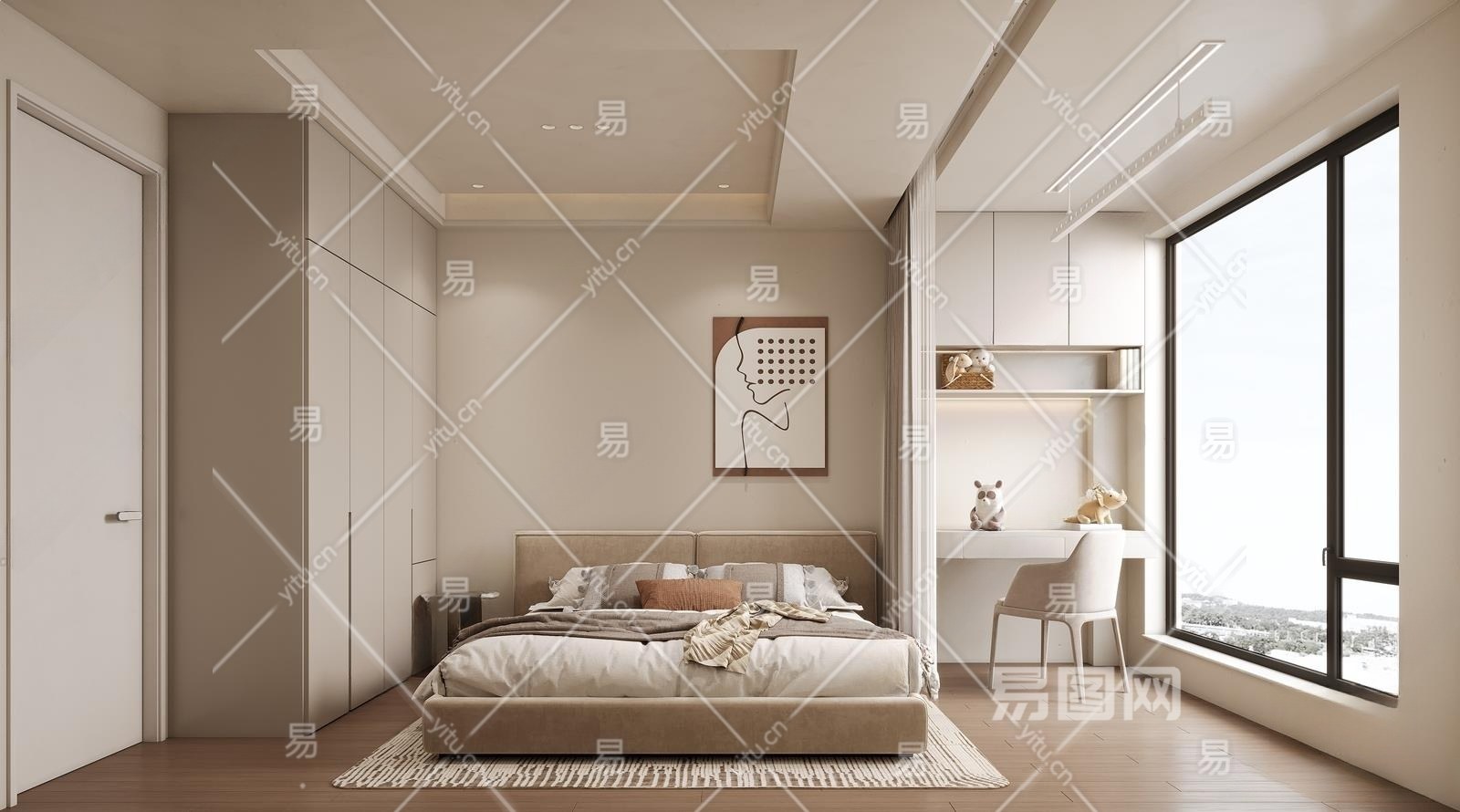 现代奶油风卧室3D模型下载
