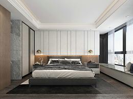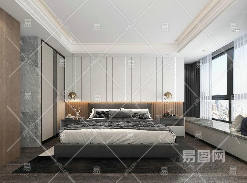 现代卧室 衣柜 吊灯 双人床 抱枕 地毯 窗帘 飘窗 床头柜