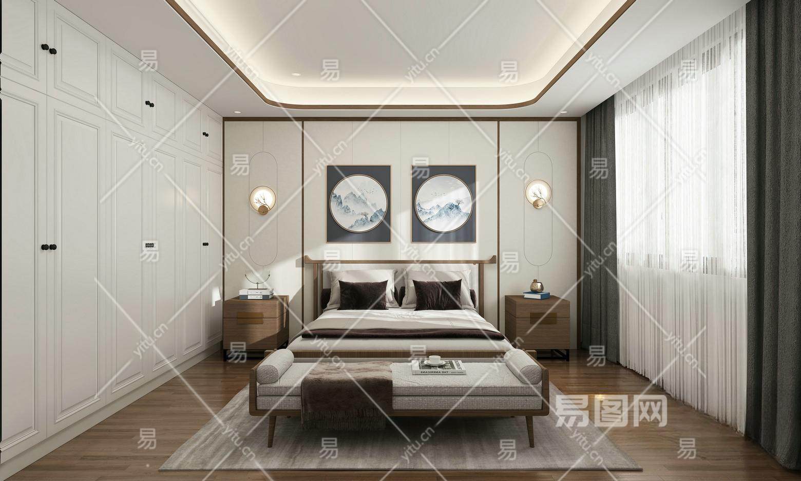 新中式卧室 挂画 双人床 壁灯 床尾凳 衣柜