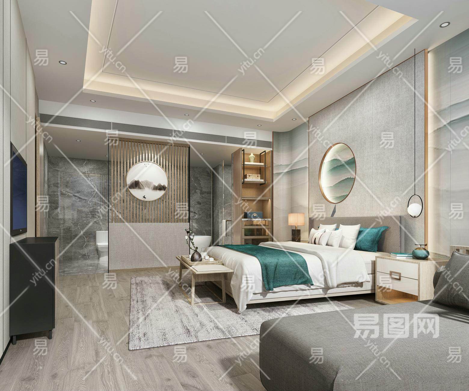 新中式卧室 挂画 双人床 床头柜 床尾凳 电视柜