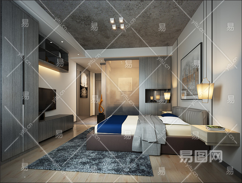 后现代 现代卧室 床 床头柜 电视柜 台灯 地毯 装饰画