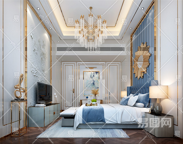 欧式奢华 欧式风格卧室 床 床头柜 灯具 电视机