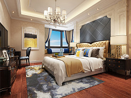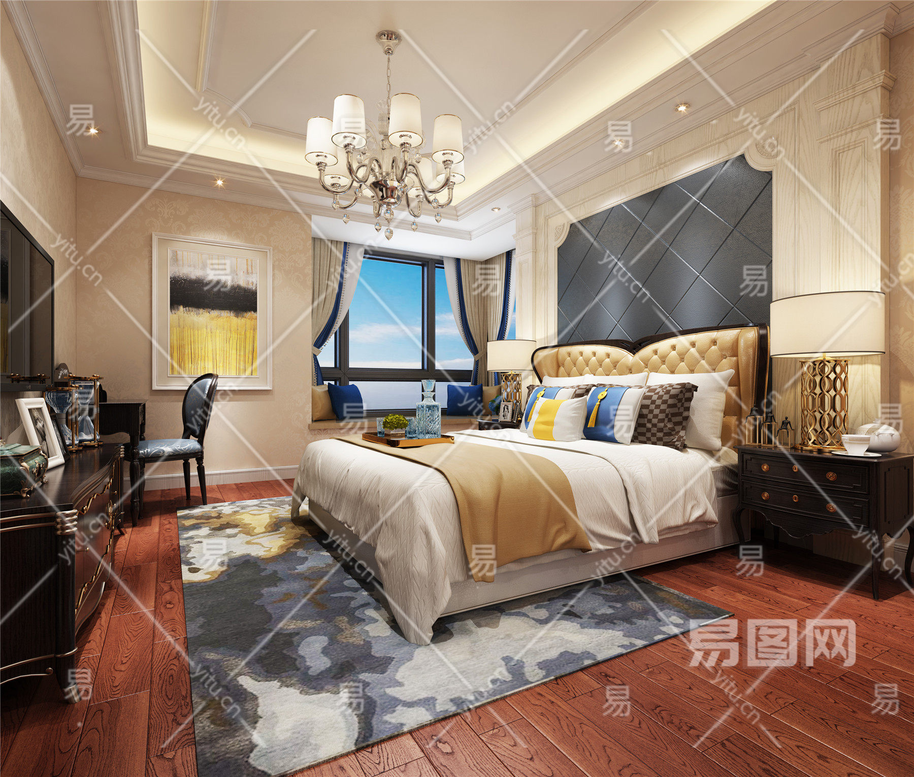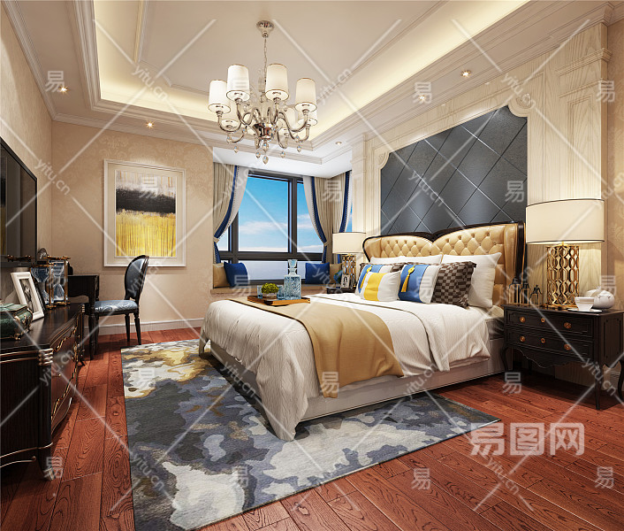 欧式简约主卧 吊灯 床 电视柜 摆件 挂画
