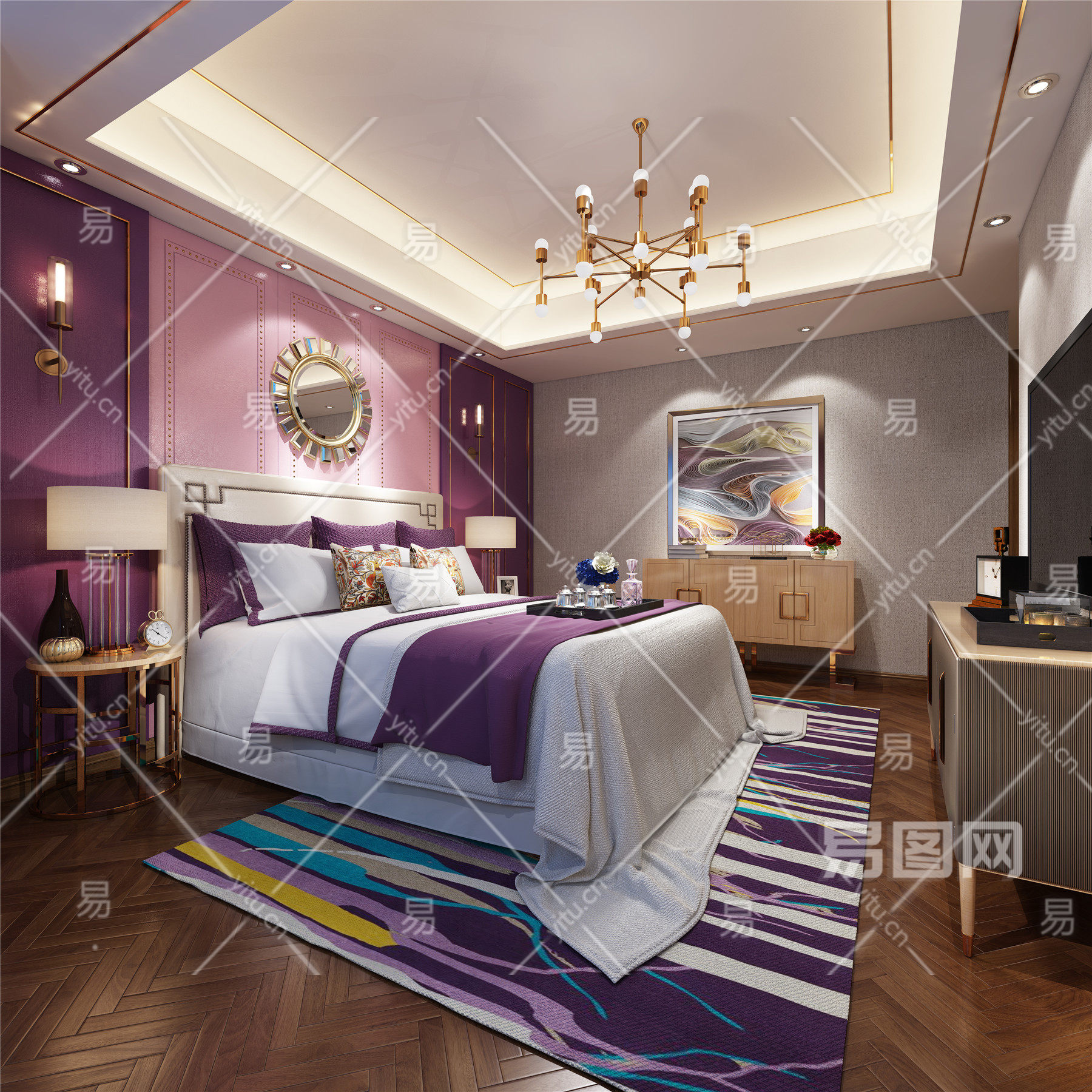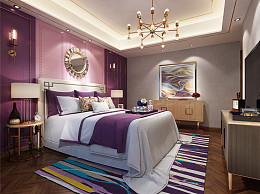 欧式简约卧室 双人床 床尾凳 床品 吊灯 床头柜