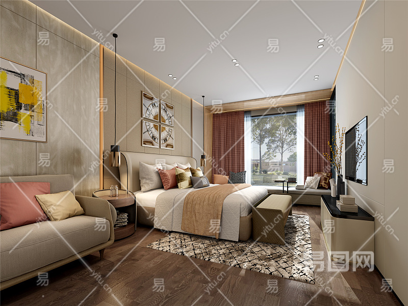 现代卧室 双人床 吊灯 雕塑小品 电视柜 沙发