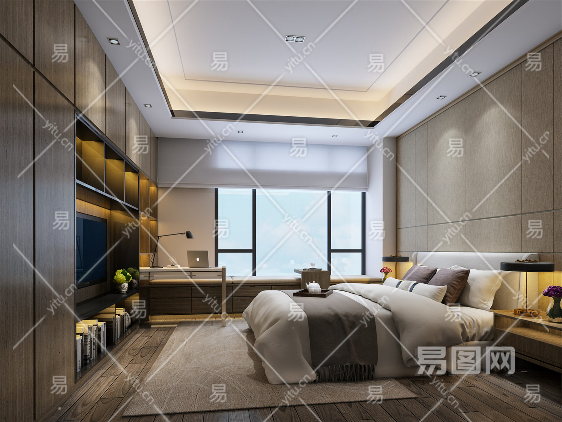 现代卧室 双人床 台灯 书桌 衣柜 花瓶