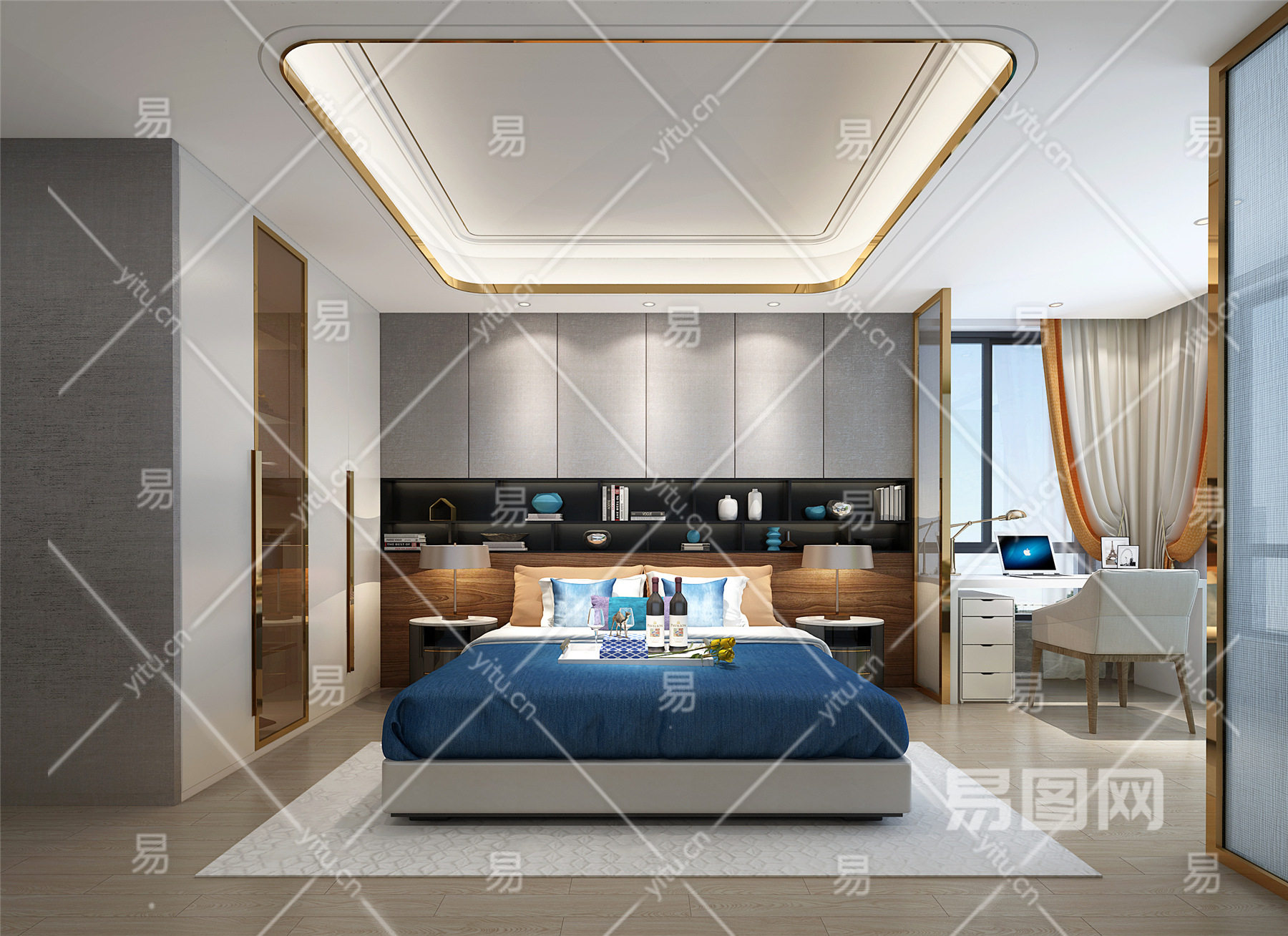 现代卧室 双人床 台灯 雕塑小品 金卫生间 书桌