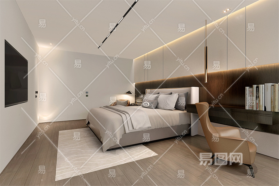 现代卧室 双人床 台灯吊灯 衣柜 书桌