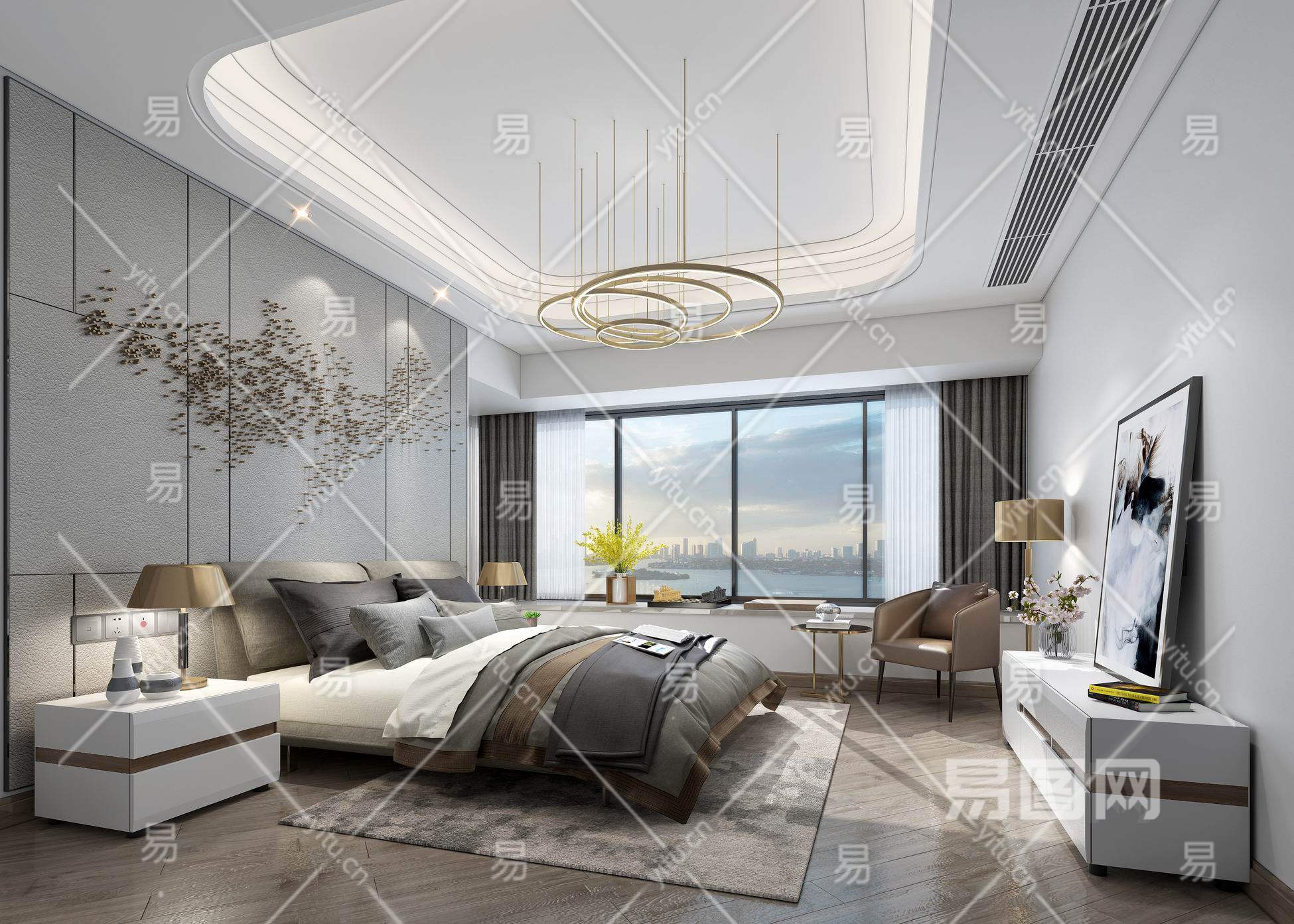 现代卧室 双人床 台灯吊灯 雕塑小品 金属墙饰 茶几