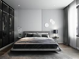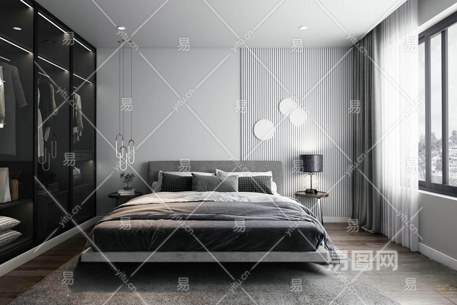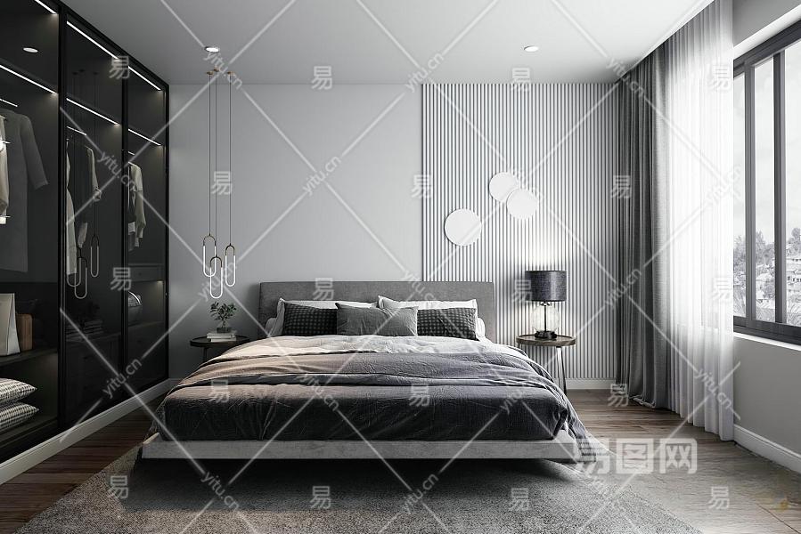 现代卧室 双人床 装饰灯 柜子 窗帘
