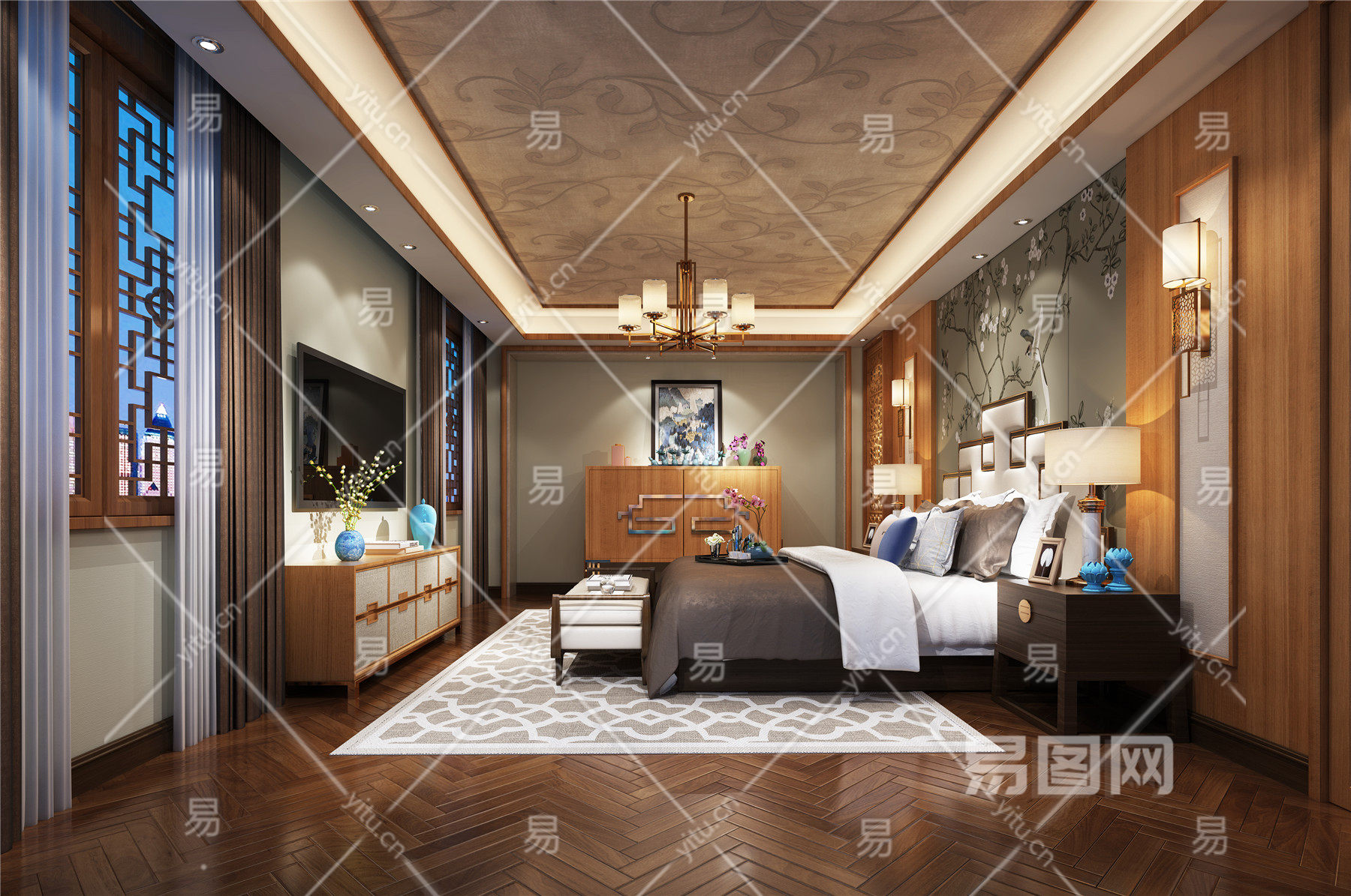 新中式卧室 双人床 床头柜 吊灯 床尾凳