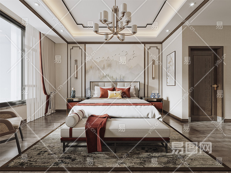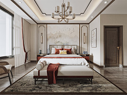 新中式卧室 双人床 床头柜 背景墙 装饰品