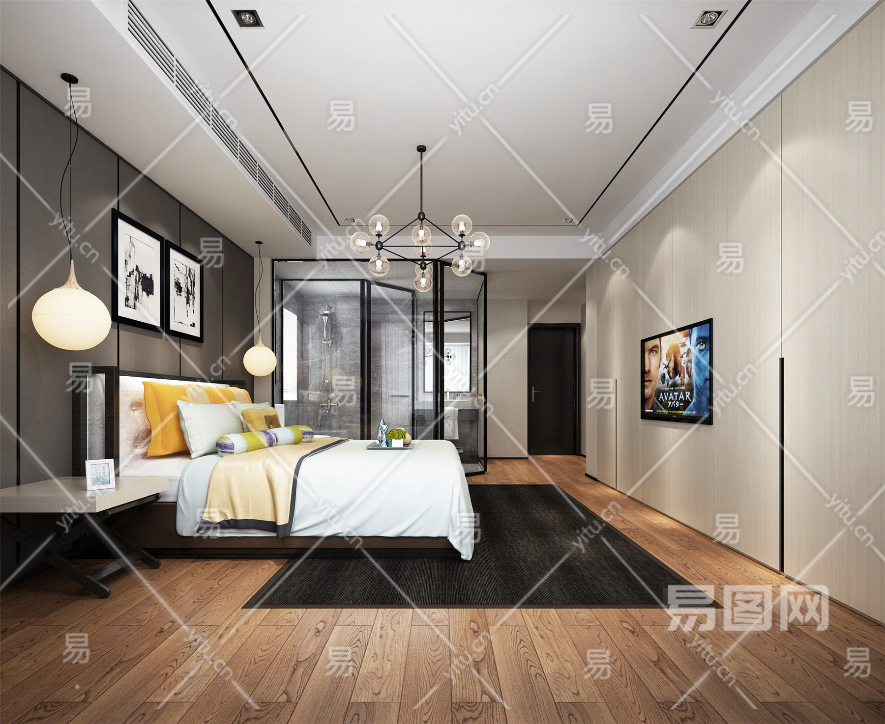 新中式卧室 极简中式家具 床 中式床 床头柜 魔豆灯 中式画