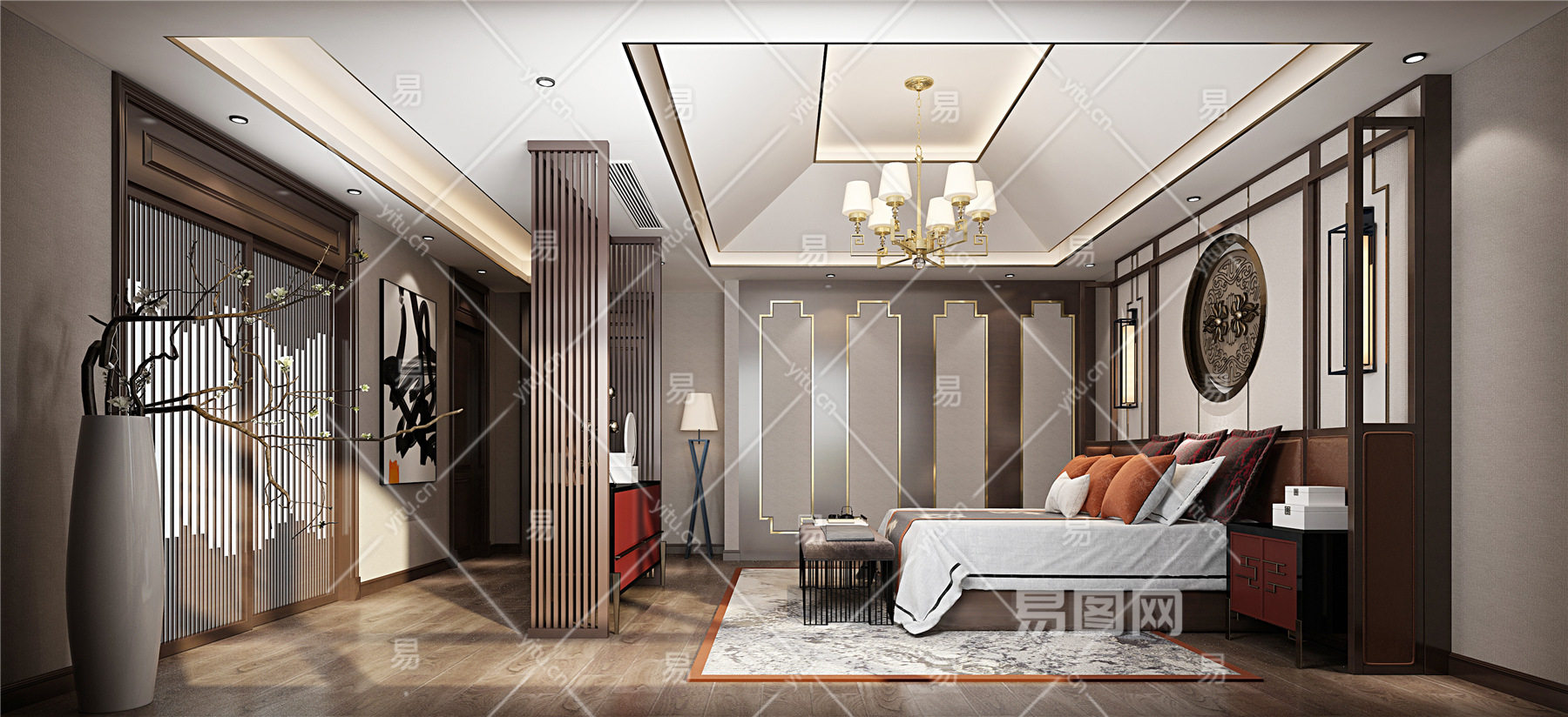 中式卧室 双人床 墙饰摆件 落地灯吊灯 屏风隔断 花瓶