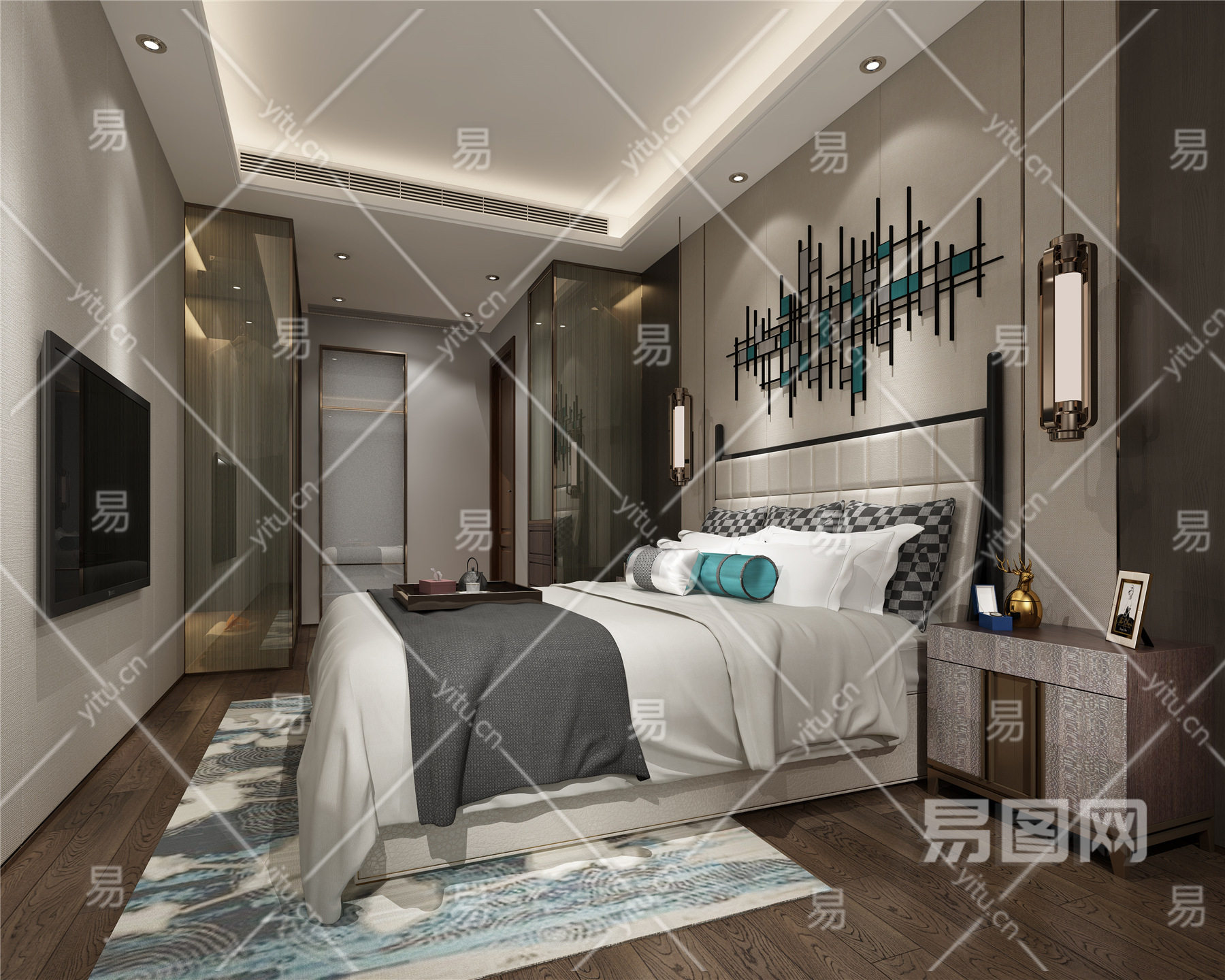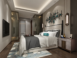 新中式卧室 双人床 墙饰摆件 吊灯雕塑 卫生间