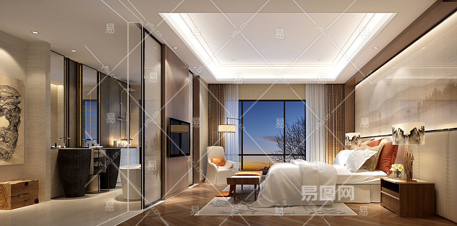 新中式卧室 双人床 洗漱台 卫生间 落地灯台灯