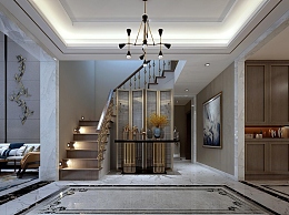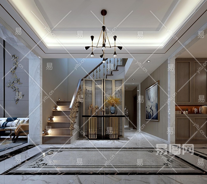 现代轻奢玄关玄关柜隔断吊灯楼梯3D模型下载