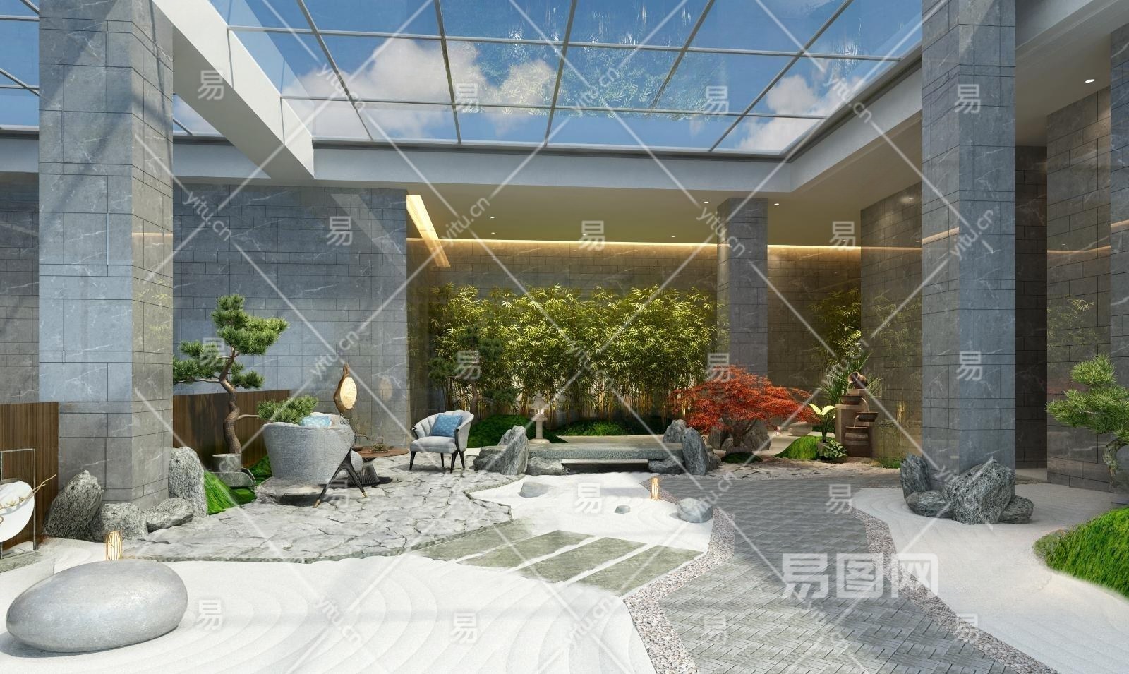 日式禅意枯山水景观大厅3D模型下载