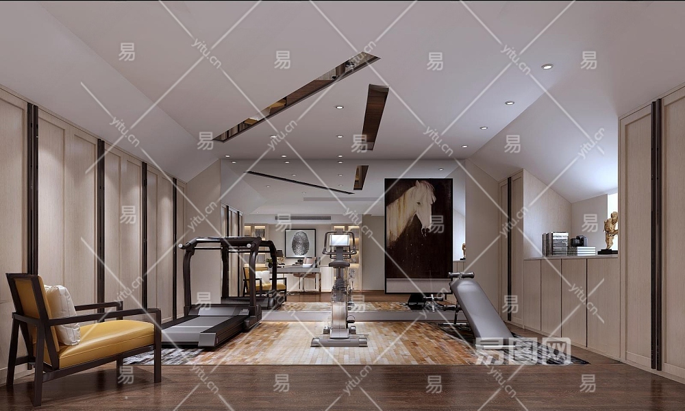现代极简健身房跑步机休闲椅装饰画3D模型下载