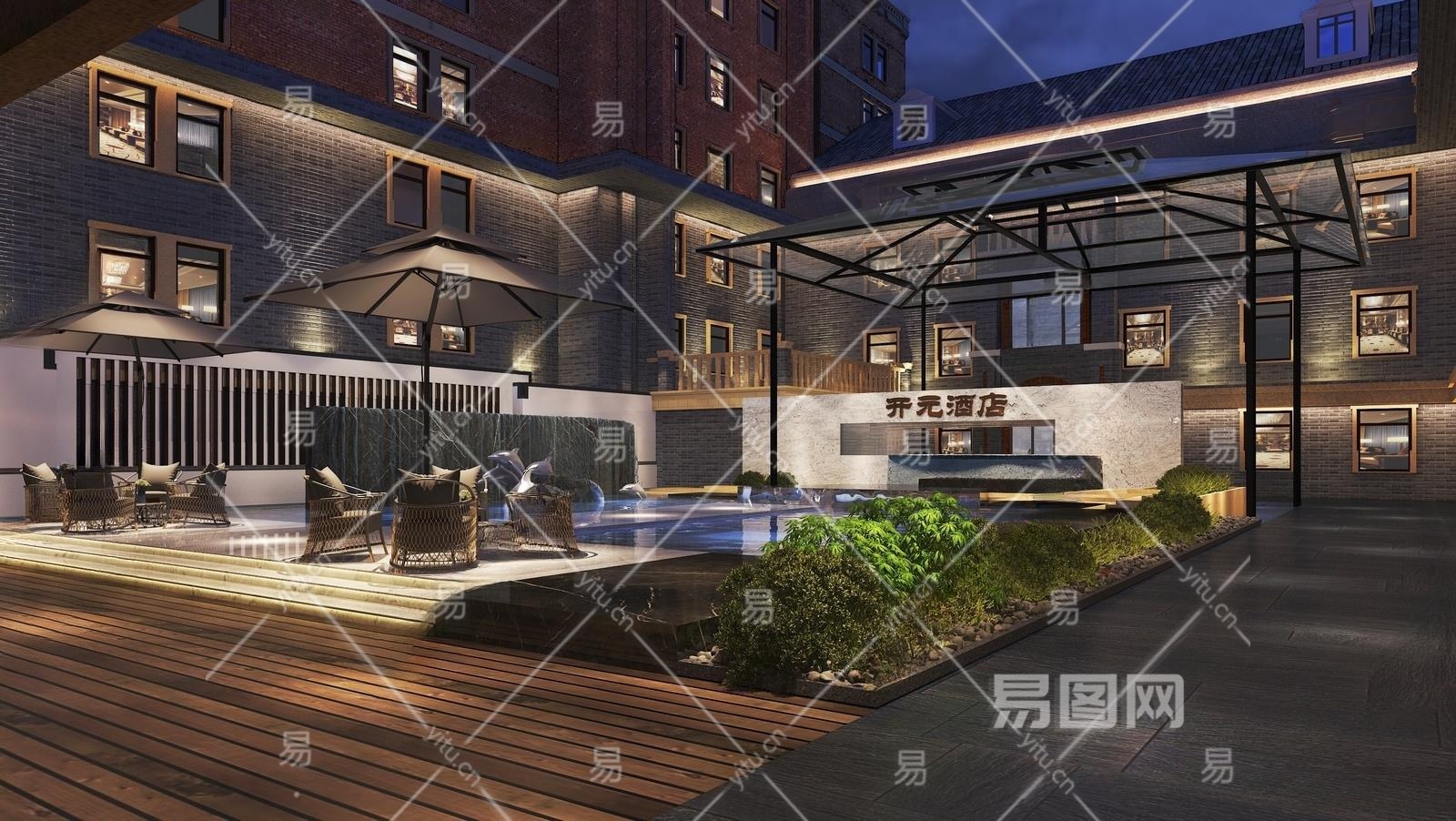 现代酒店庭院景观3D模型下载