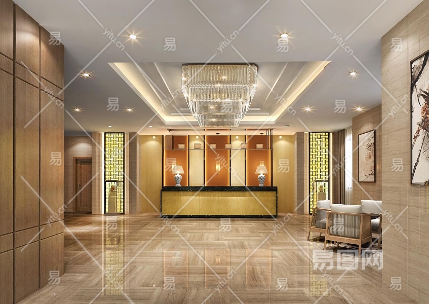新中式酒店大厅3D模型下载