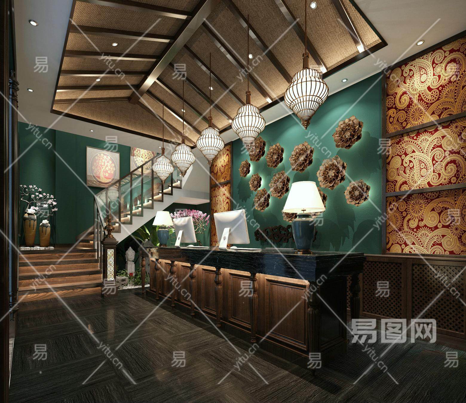 新中式酒店大堂 前台 端景 楼梯间 斜顶 接待区