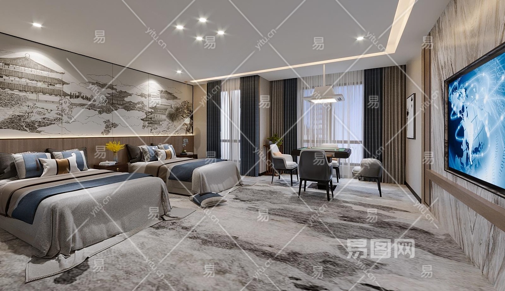 新中式酒店客房3D模型下载