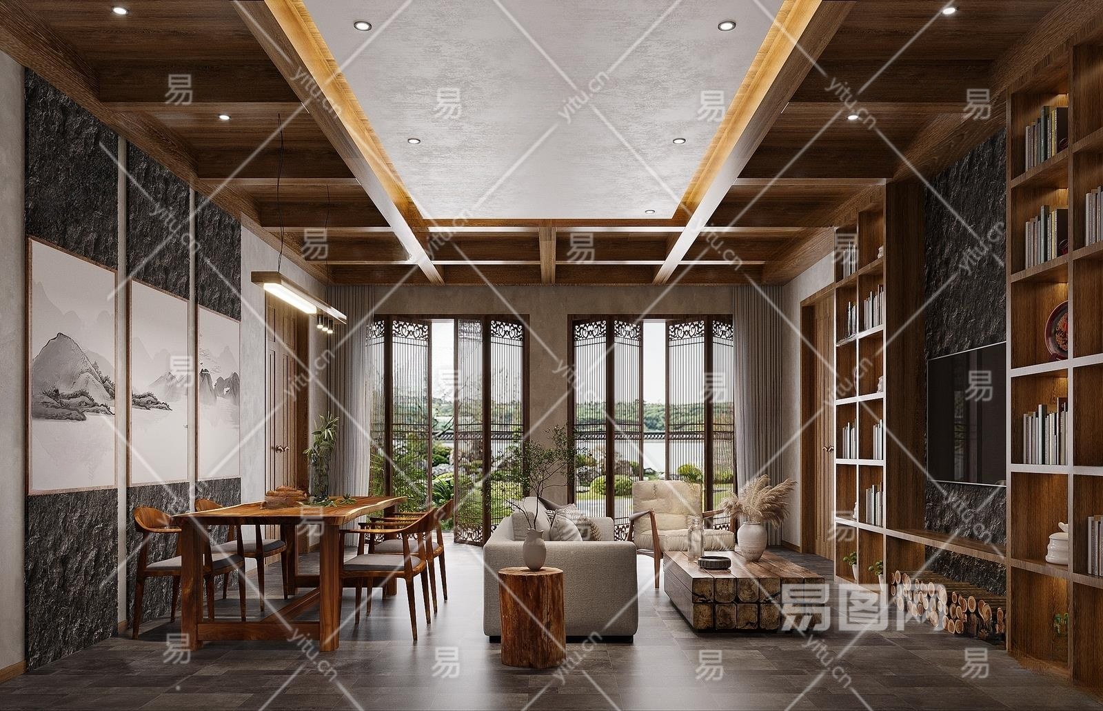新中式民宿前厅3D模型下载