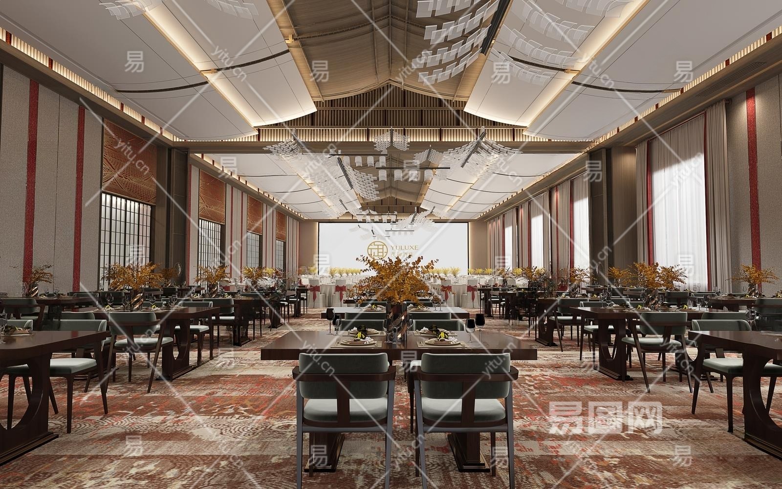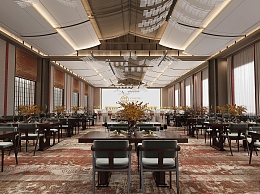 新中式酒店宴会厅餐区3D模型下载