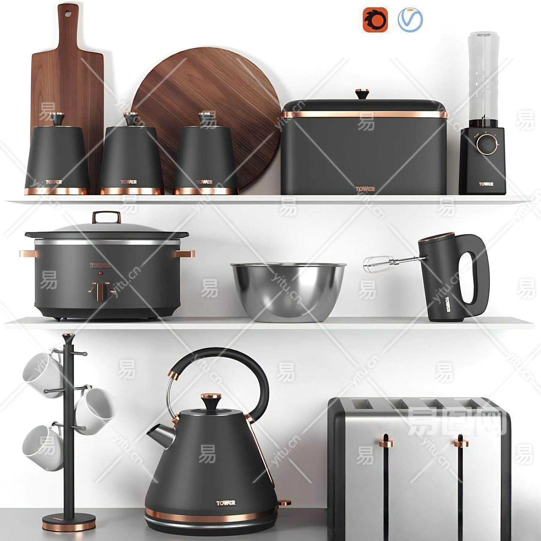 当前的位置:首页 > 3D模型 > 厨卫用品 > 厨房用品组合 > 现代厨房电器烧水壶面包机电饭煲