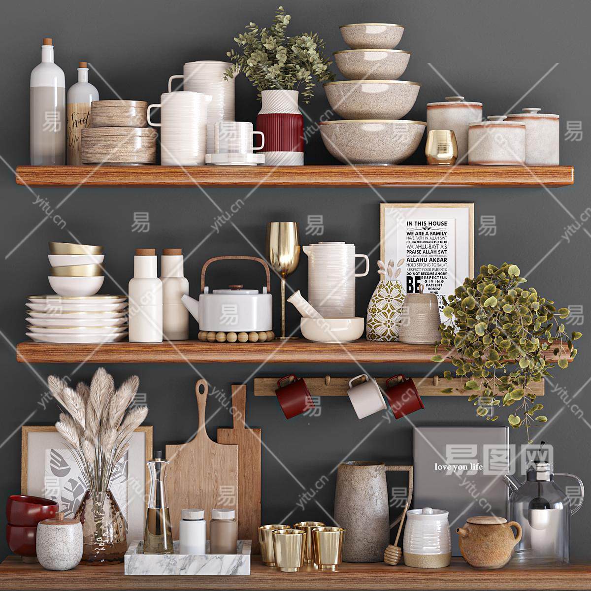 当前的位置:首页 > 3D模型 > 厨卫用品 > 厨房用品组合 > 现代厨房搁板摆件 碗碟调味瓶