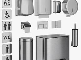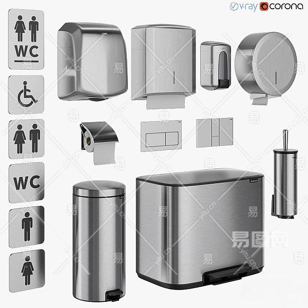 现代公用卫生间器材组合 烘干机 垃圾桶 马桶刷 纸巾盒 抽纸 洗手液