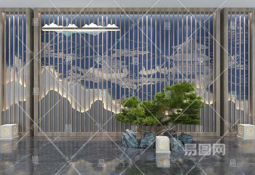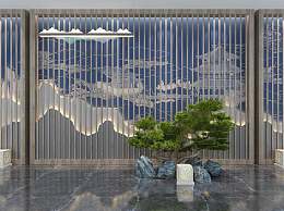 新中式山水背景墙3D模型下载