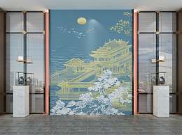 新中式夹绢玻璃背景墙3D模型下载