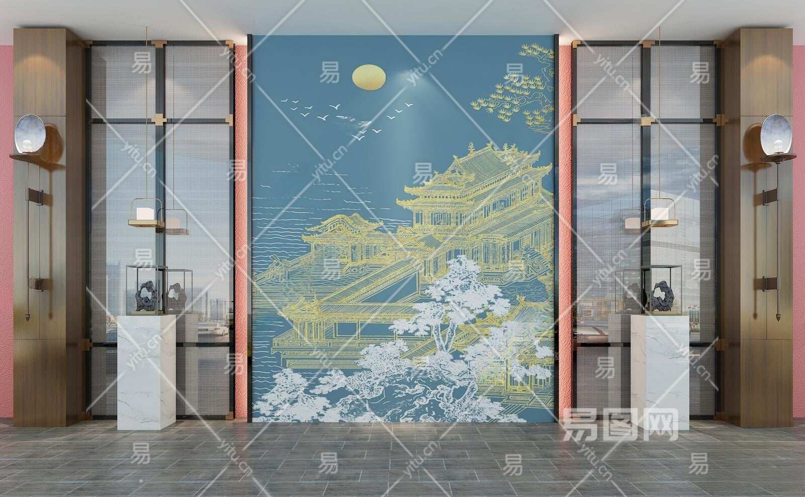 当前的位置:首页 > 3D模型 > 通用空间 > 背景墙 > 新中式夹绢玻璃背景墙3D模型下载