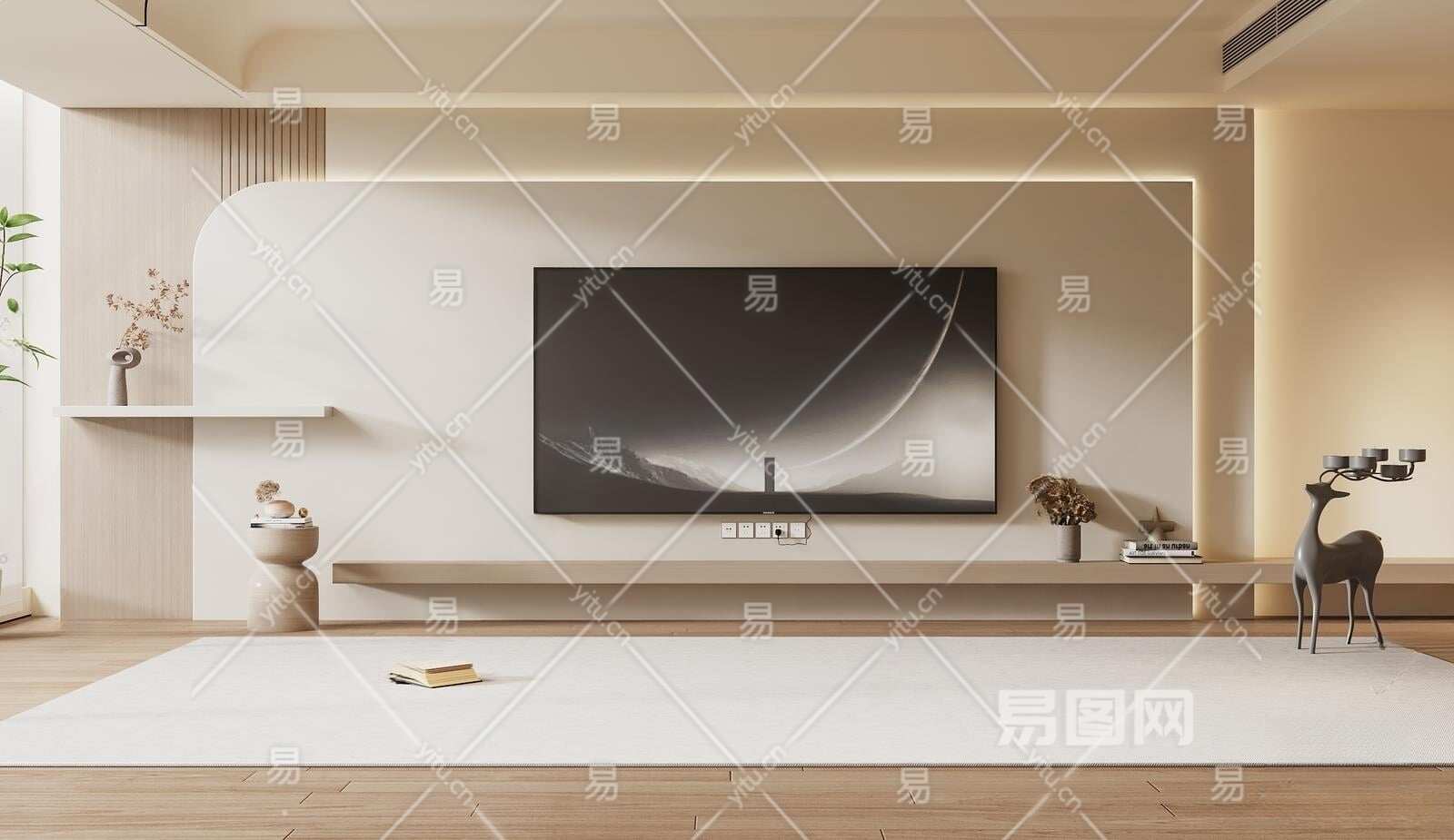 现代奶油风电视背景3D模型下载