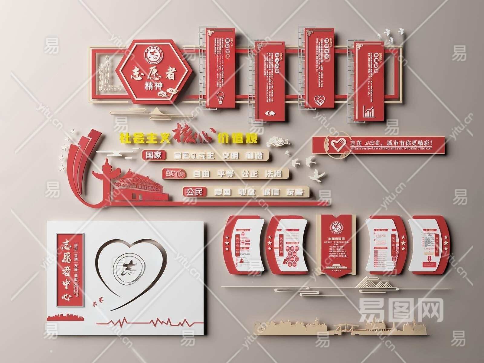 新中式党建文化宣传墙3D模型下载