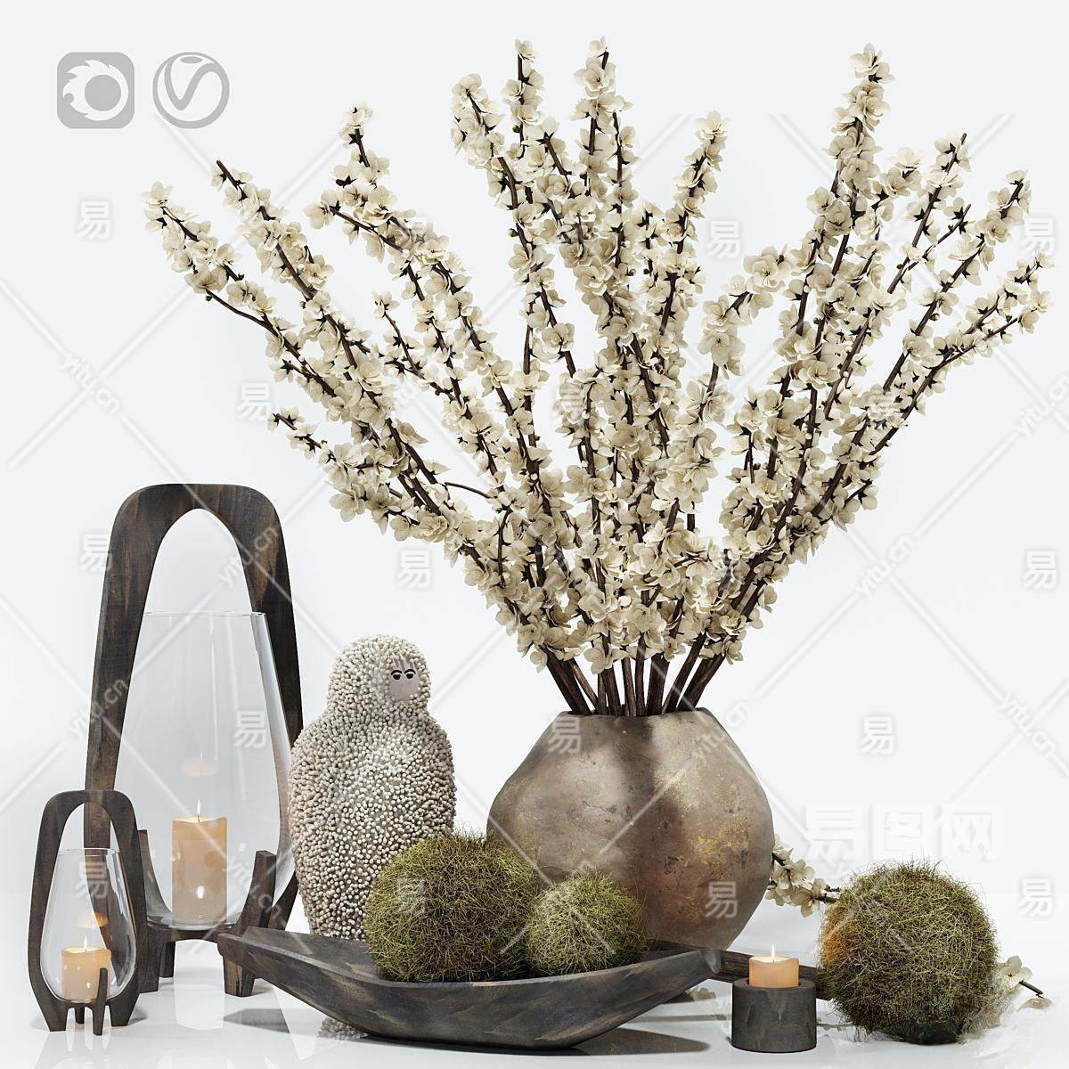 现代摆件组合 花瓶 花艺 苔藓球 蜡烛台灯