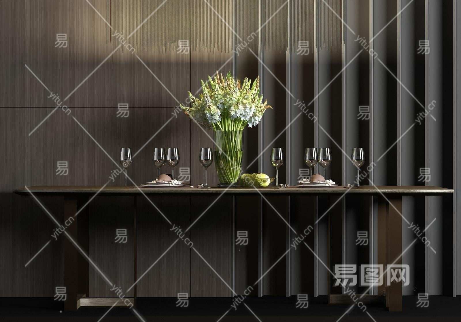 现代金属实木餐桌餐具吊灯饰品组合3D模型下载