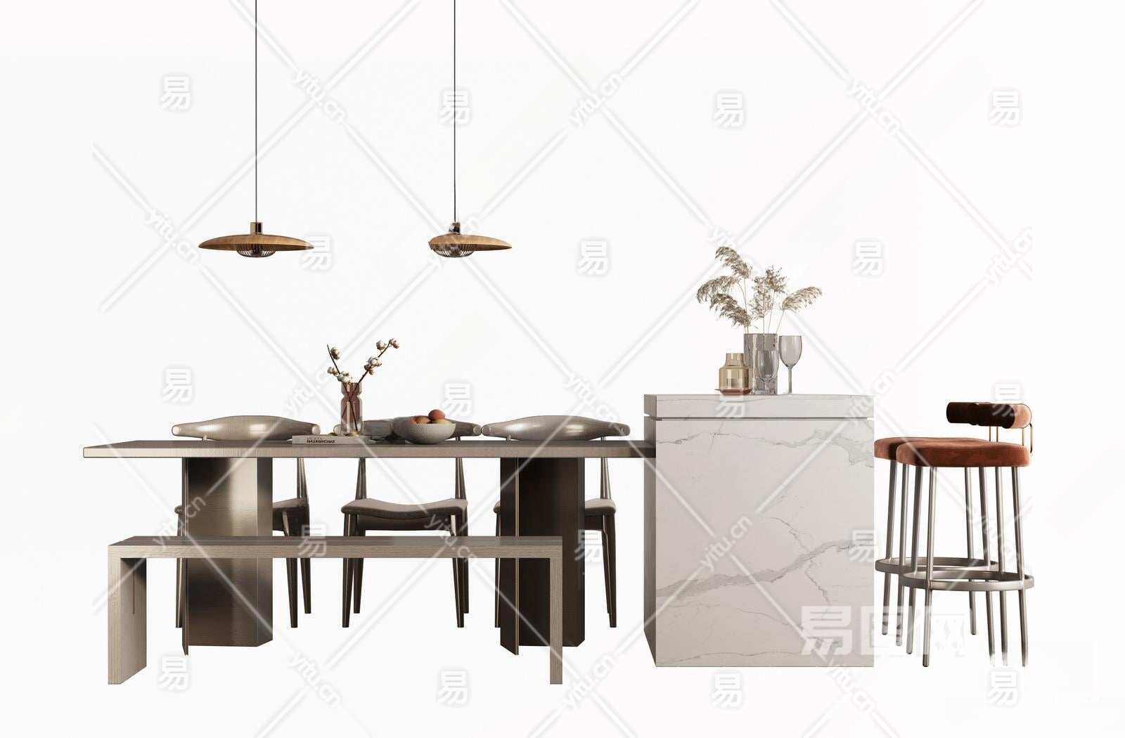 现代吧台吧椅组合3D模型下载