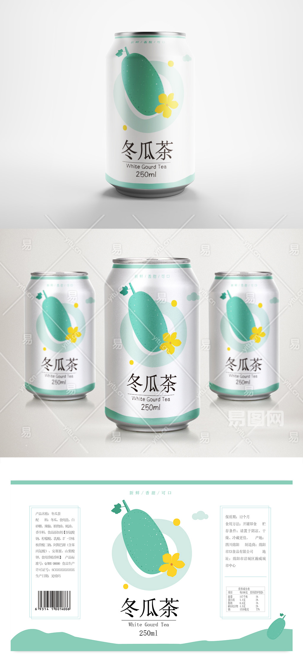 当前的位置:首页 > 广告设计 > 包装 > 饮料包装 > 清新简约冬瓜茶易拉罐饮料包装