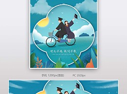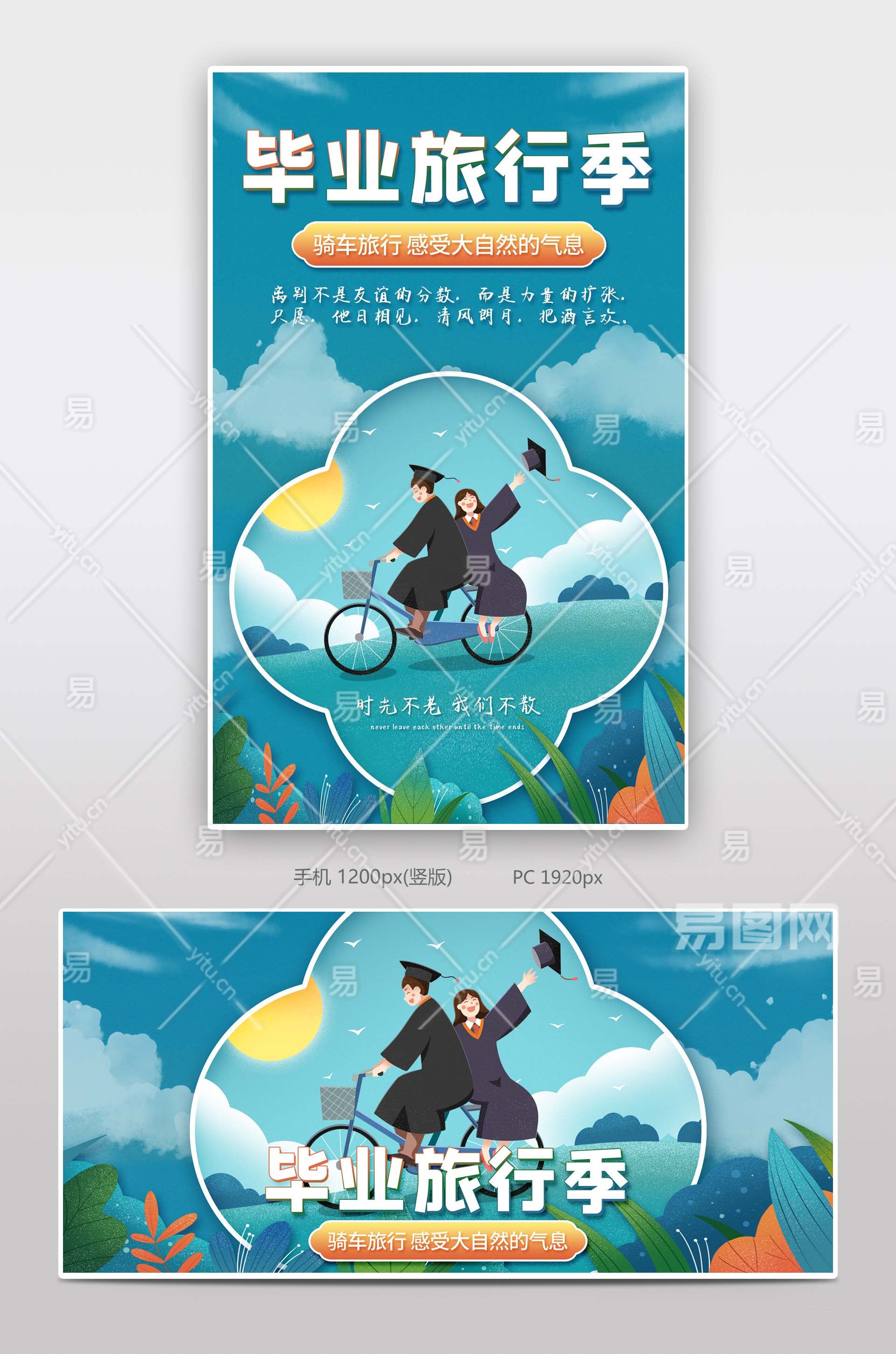 蓝色简约插画风毕业旅行季同学旅游电商海报