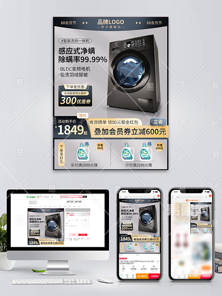 当前的位置:首页 > 广告设计 > 电商海报 > 数码家电 > 电商洗衣机家电黑金88会员节主图直通车版