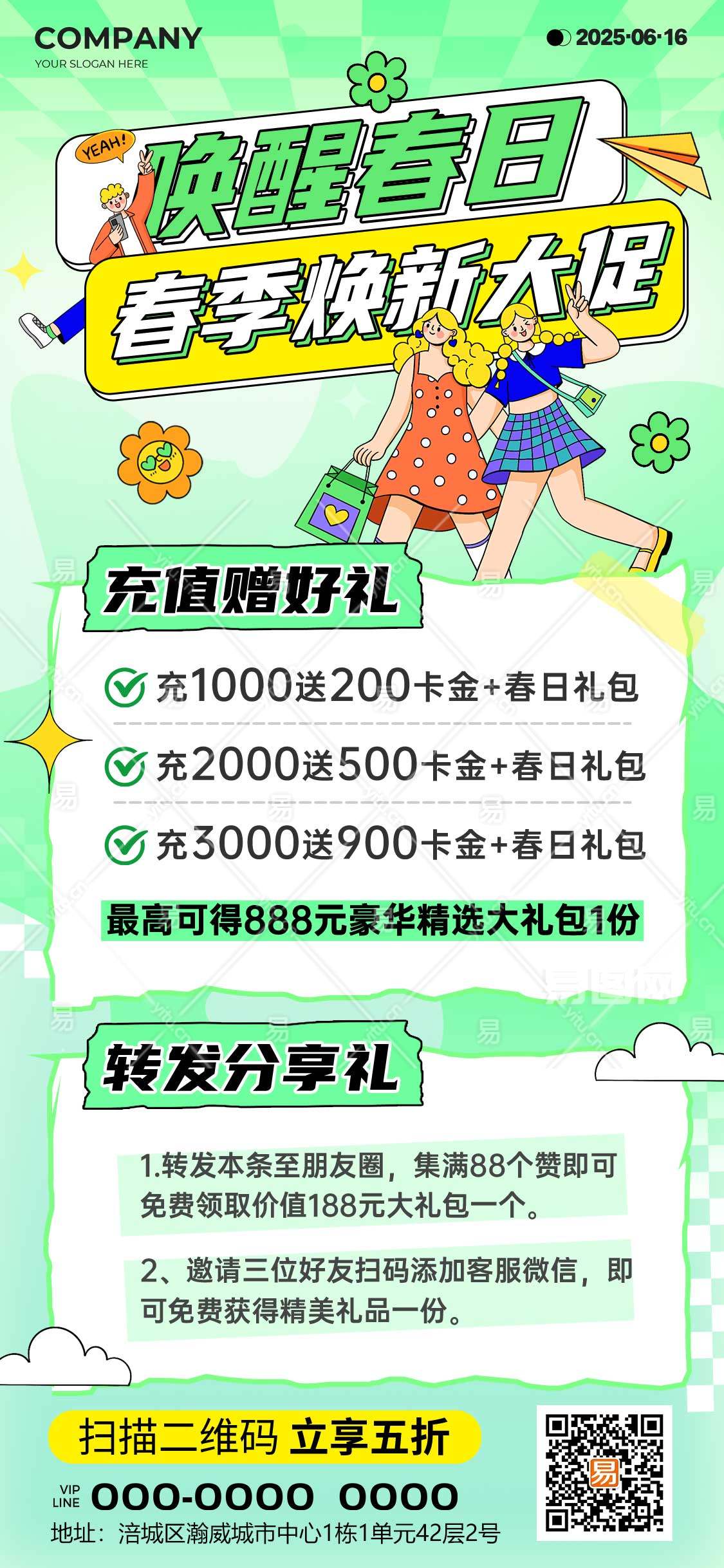 绿色扁平插画风唤醒春日春季促销活动手机文案海报