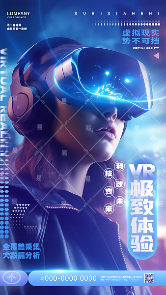 蓝紫炫酷简约VR虚拟现实VR科技体验手机海报AI