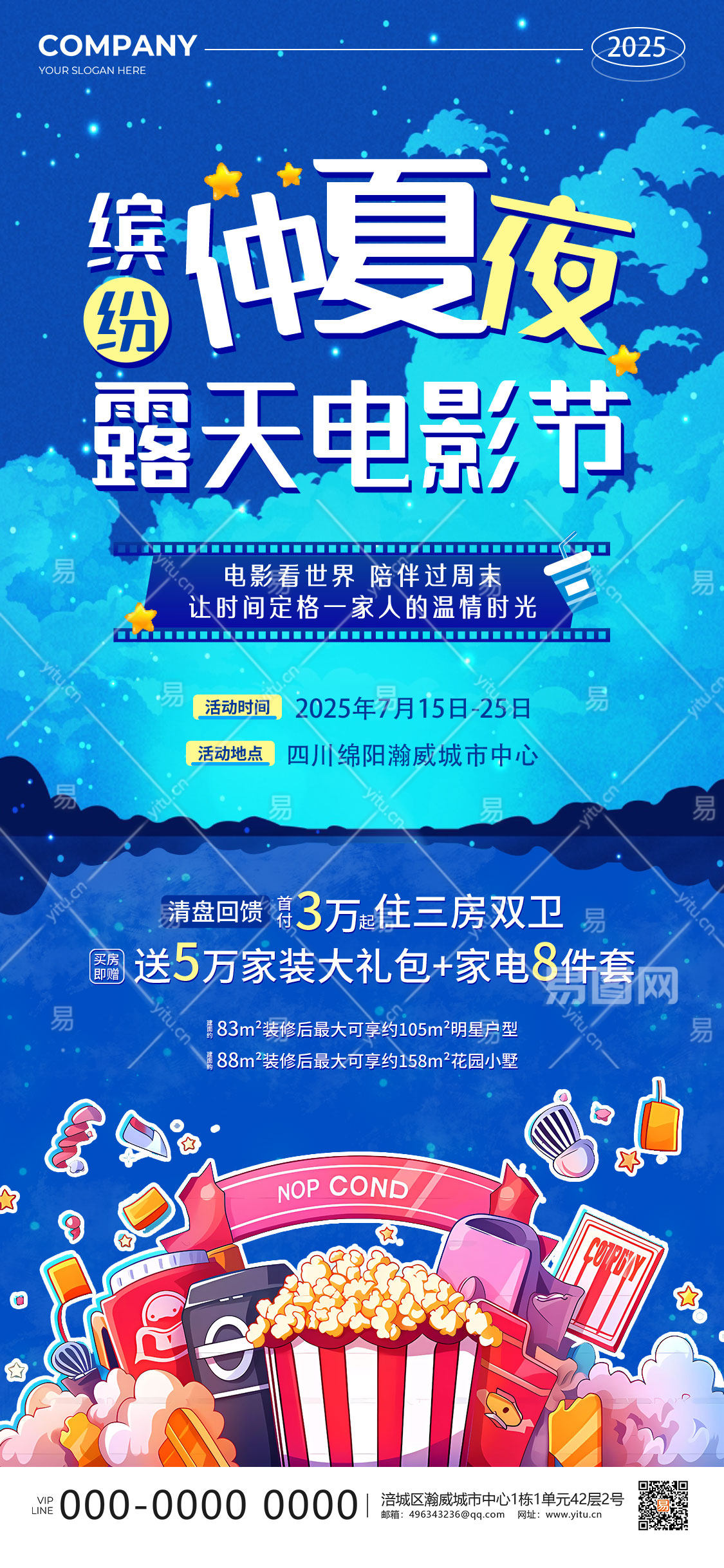 蓝色插画风夏季缤纷仲夏夜电影活动手机文案海报夏天活动促销