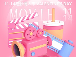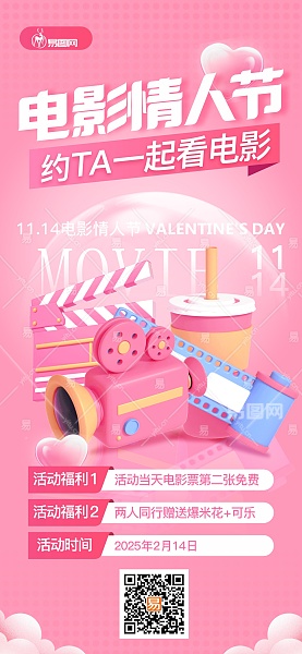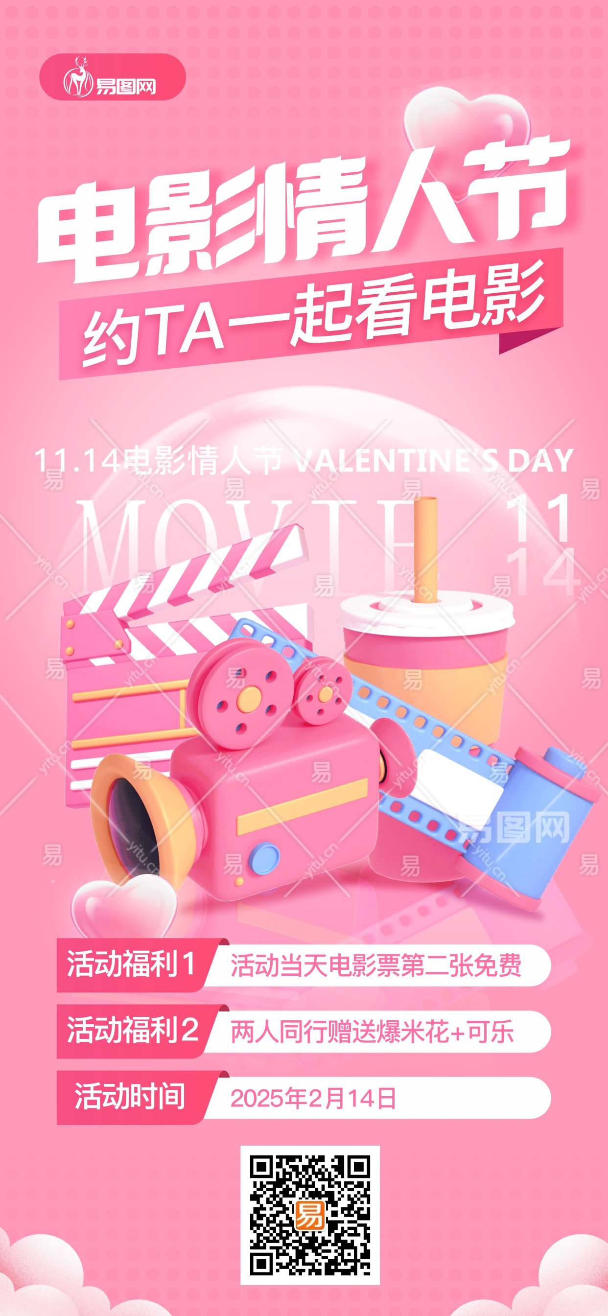 粉色简约浪漫3d元素电影情人节影院促销海报